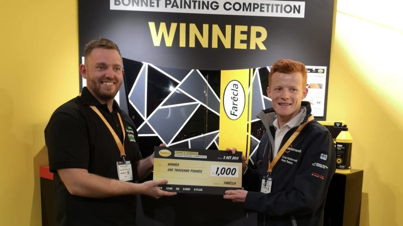 Elliot Campbell (24) from The Figaro Shop (Didcot) and winner of the Farécla Apprentice & Student Bonnet Painting Competition was presented his prize by Daryl Head (Nationwide CRC and Silver Medallist at the World Skills in Abu Dhabi) on the Farécla stand at the Advanced Engineering Show 2018.