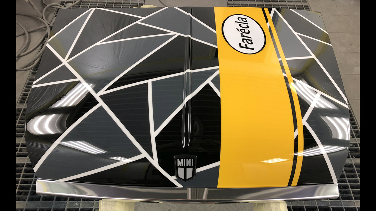 I knew what I wanted it to look like but I never had a solid drawing. I knew I didn’t want to do a massive bonnet purely because I had to keep it 1m by 1m. I was going to do a hot rod bonnet but it was hard to integrate the design with that so I looked at the classic MINI bonnet, I liked the shape of it and an old school friend of mine he had a MINI that he was building and thankfully he let me have the bonnet which I paid him for. It was a bit tatty and dented just through its age and had defective paint on there as well, so I took it all back to bare metal. On the Farecla competition website it showed basically a yellow stripe on several examples so I knew I wanted to put a stripe in and with having the MINI bonnet as well, being a classic bonnet they have a white stripe on some MINIs so a yellow stripe worked quite well as part of the design in the original realm but with a Farecla twist.