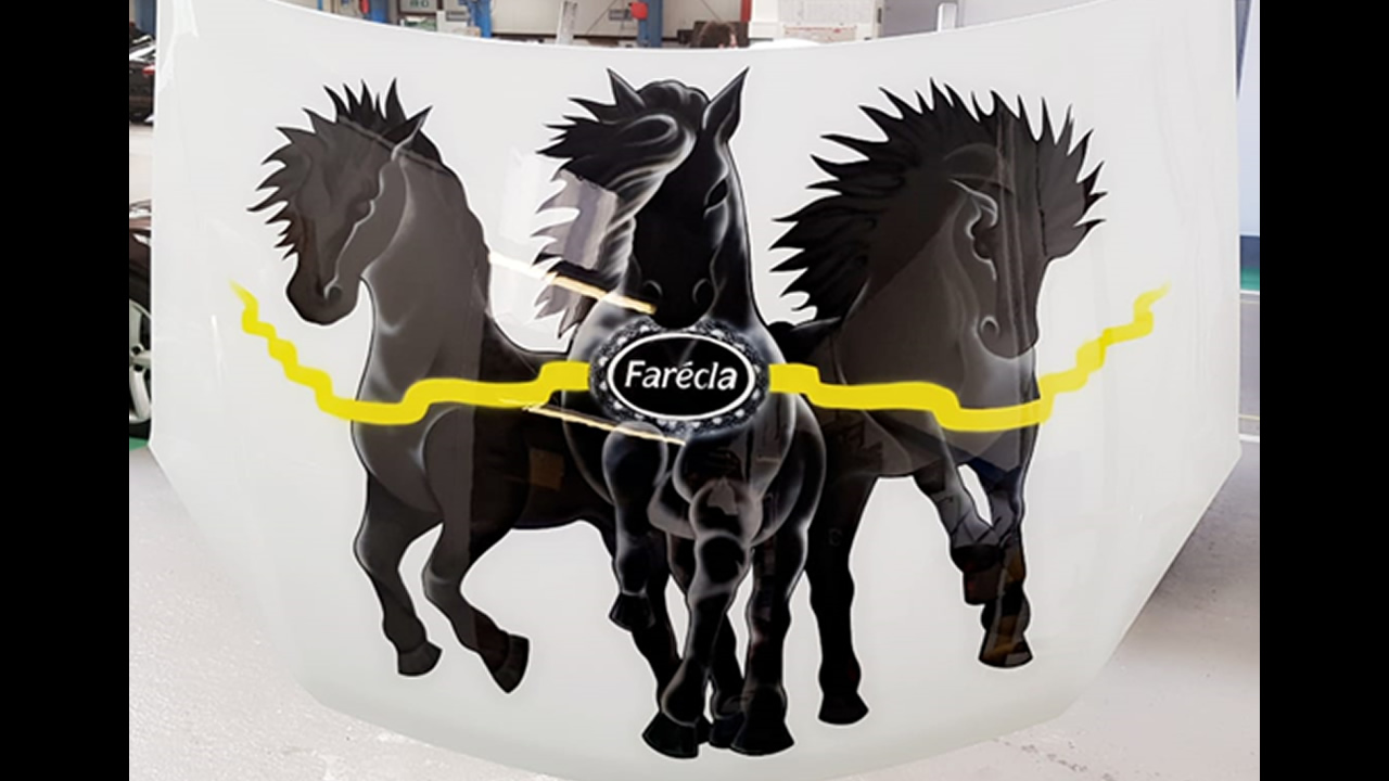 The design idea is linked to everything to do with the bonnet competition and directed to Farécla. My first thought, Stallions, came from the quite obvious connection with cars, but not everyone seems to relate to it, horse power. So I decided to go with a black Stallion because they are known to be the fastest horses, the middle one which is Farécla branded, they are meant to be racing and that one is winning the race, it is crossing the finishing line first so it is the best and they are the leading company and then it is a finish line because they specialise in finishing/polishing products.