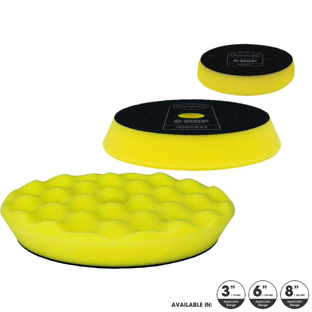 La gama de Almohadillas de Espuma para Pulido G Mop ha sido diseñada especialmente por sus excelentes propiedades de corte y brillo, mínimo desprendimiento (desorden) y baja temperatura de operación cuando se usan con la gama de Compuestos y Pulimentos de Farécla.