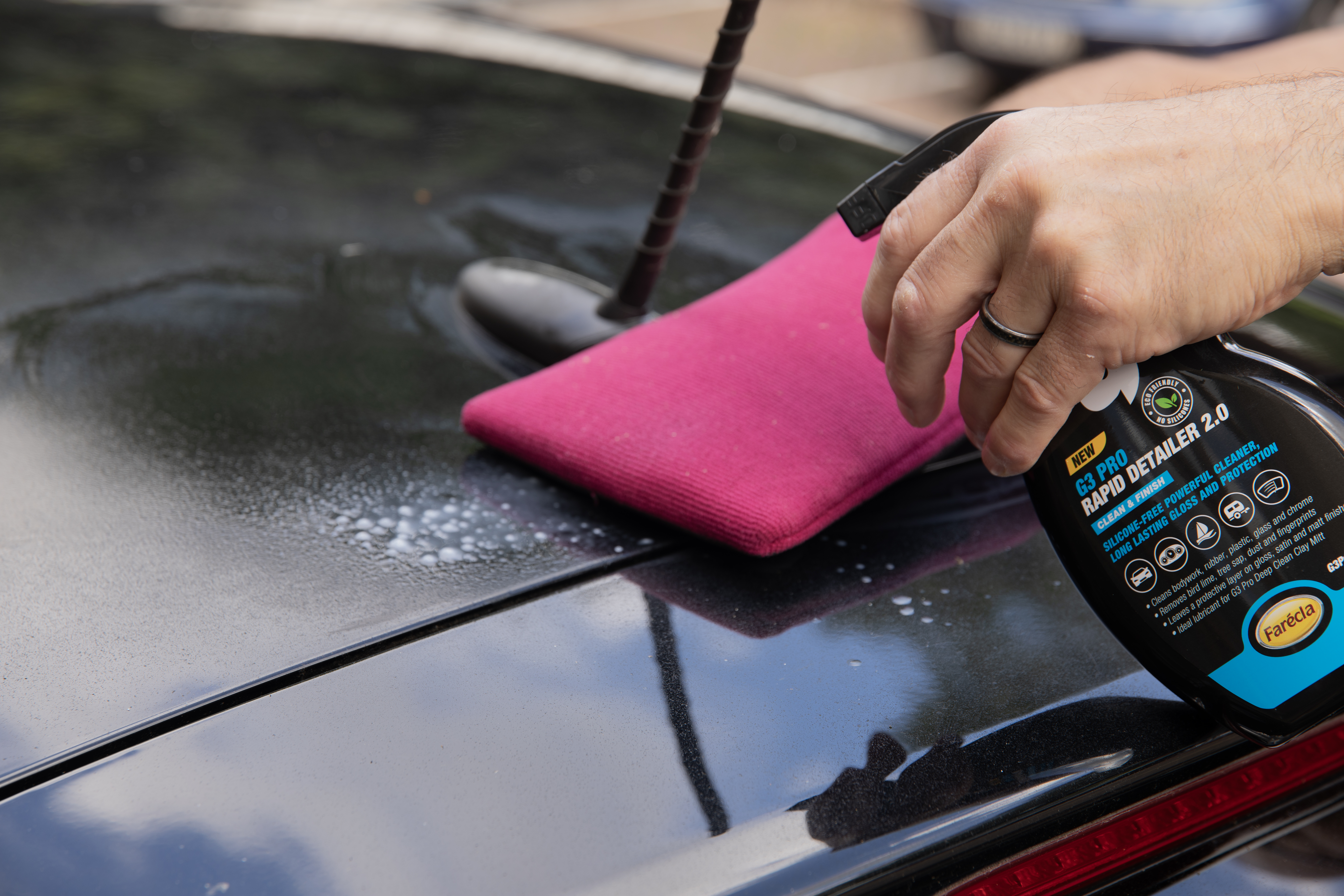 - Po pierwszym umyciu powierzchni, rozpyl G3 Pro Rapid Detailer zarówno na wybranym obszarze roboczym, jak i na rękawicy G3 Pro Deep Clean Clay Mitt.